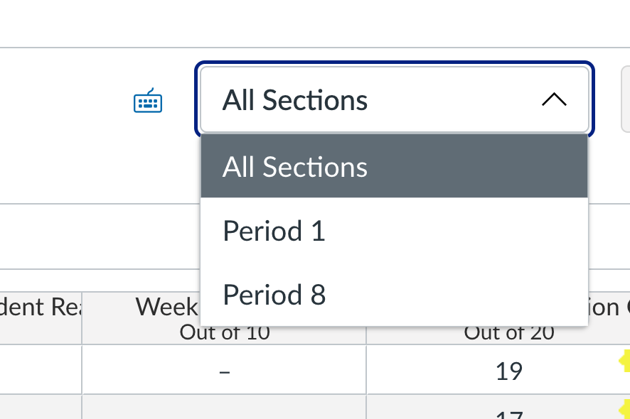 To resolve this, go into the Canvas gradebook and on the top-right dropdown change the View setting to the section you would like to see grades for, or "all sections".