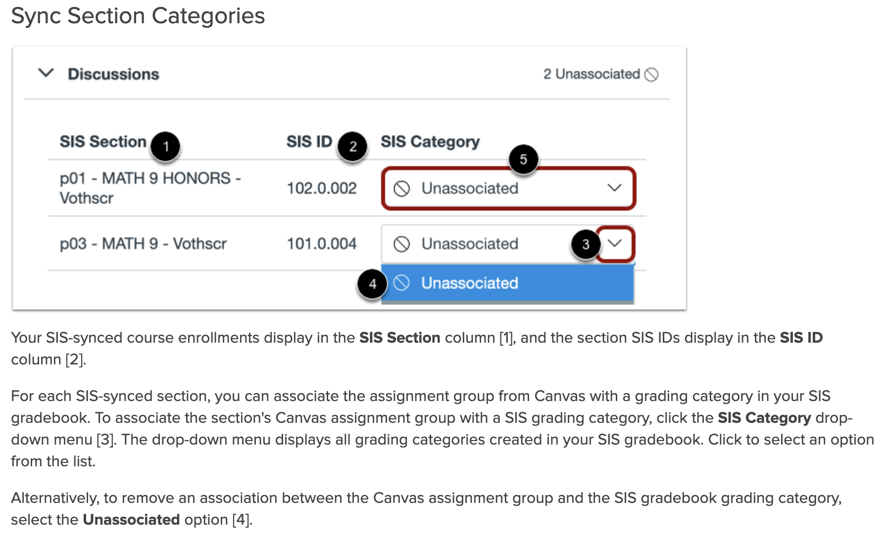 The image below is an example of how a teacher set this up. As you see, the Canvas category "Homework" is sync'd to the SIS Category "Homework". You can see at a glance all of the areas that have been synchronized or "Associated" with the green check mark.