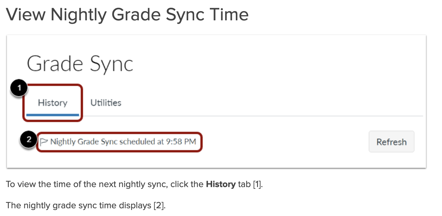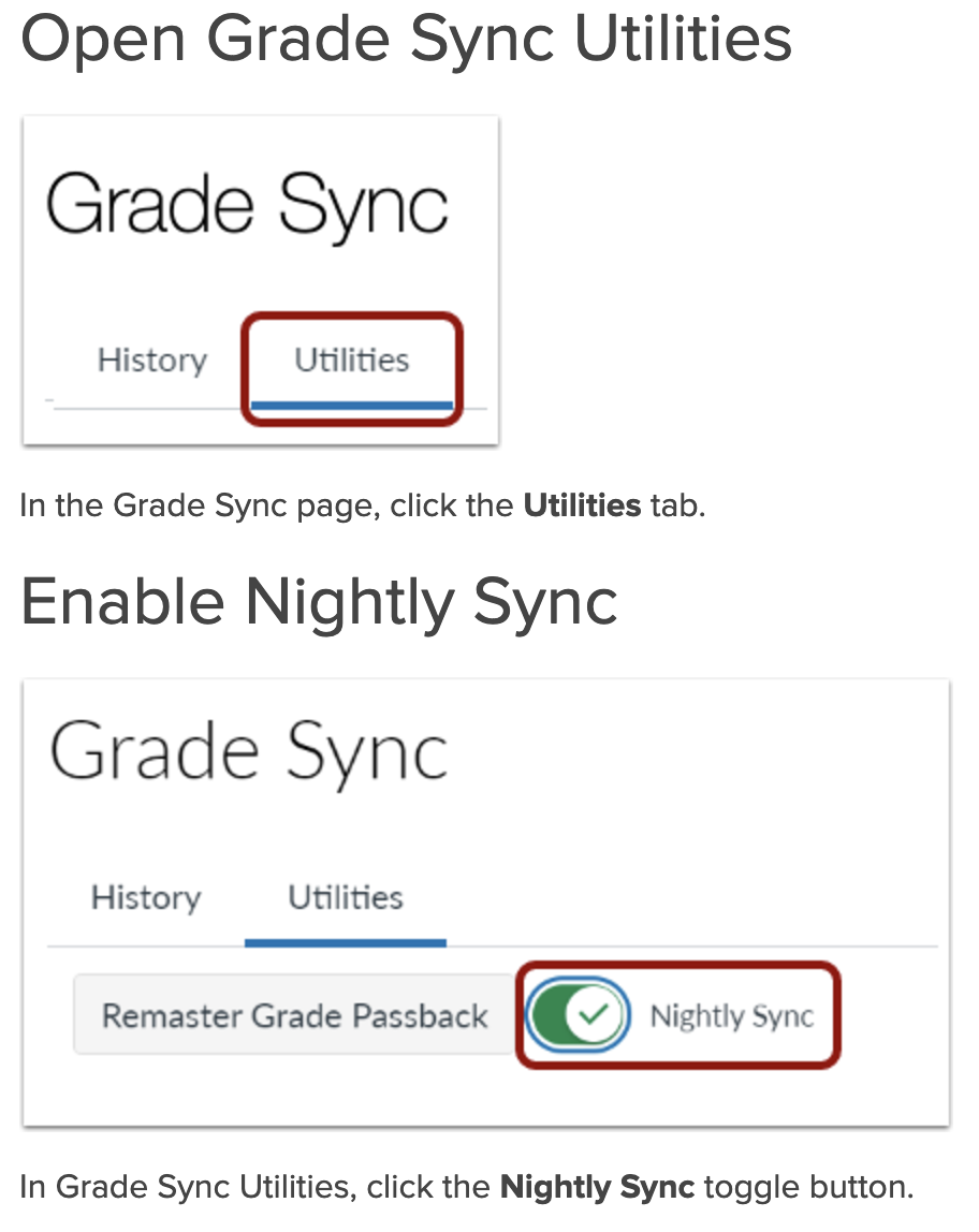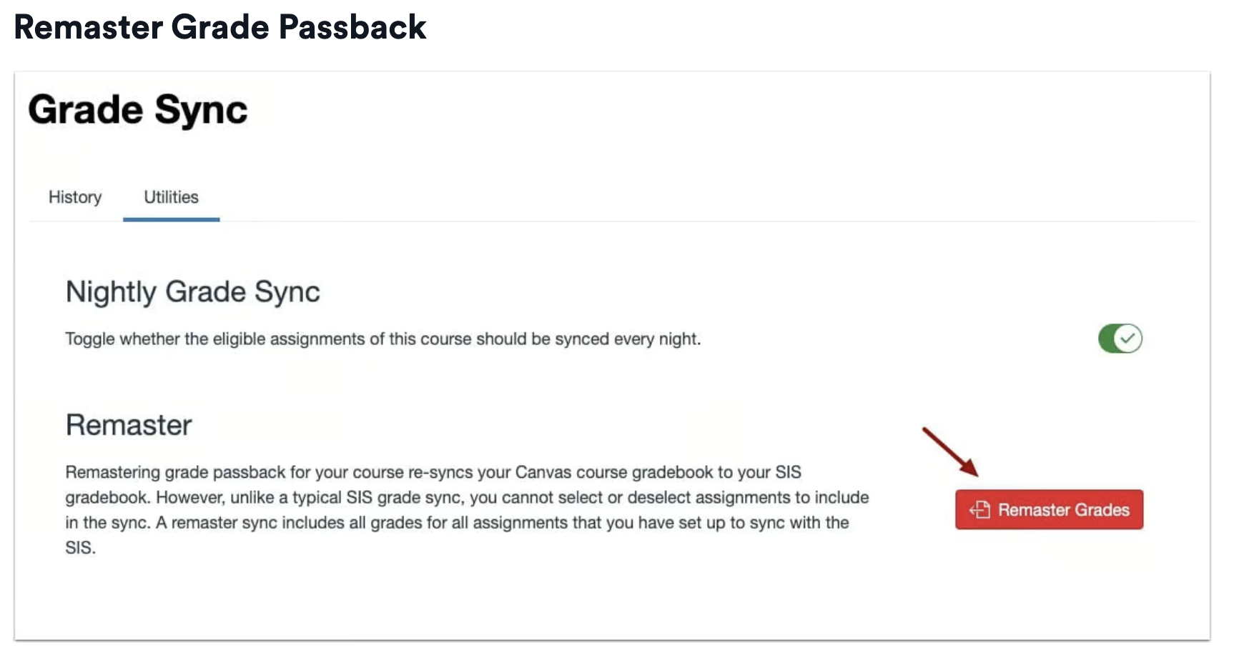- If an assignment was previously synchronized and there is a late grade entered at a later time, or there is a grade change for some reason, you may click the "Remaster Grade Passback" button which will update the grade to the latest status. This option is found in the Utilities tab from the Grade Sync menu.