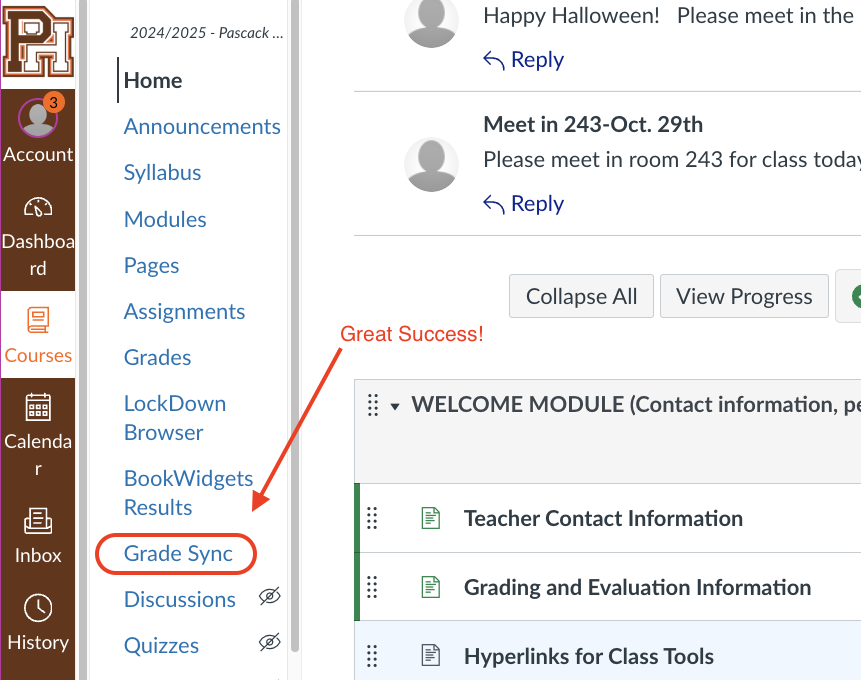 If you do not see the Grade Sync menu item, you need to go to Settings / Navigation and drag it up from the Disabled/Hidden area to the Enabled/Viewable area. Scroll down to Troubleshooting for details.