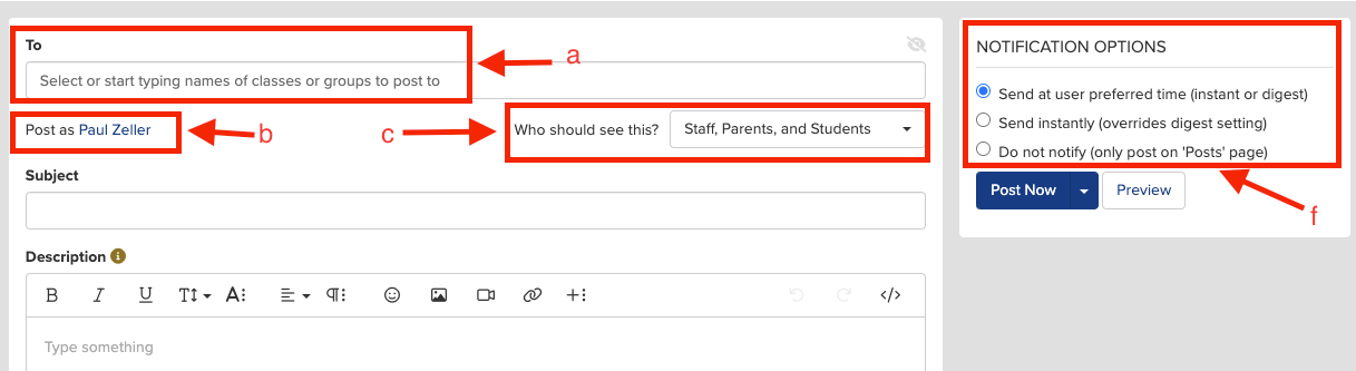 - To - these are the groups (classes; club; sport team) you can send posts to (typically groups you own/manage). Note: you cannot send to individuals