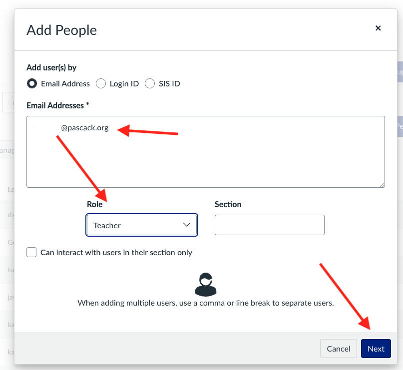 - A box will open and you can enter the Teacher's email address, select Teacher as the Role and click on Next.